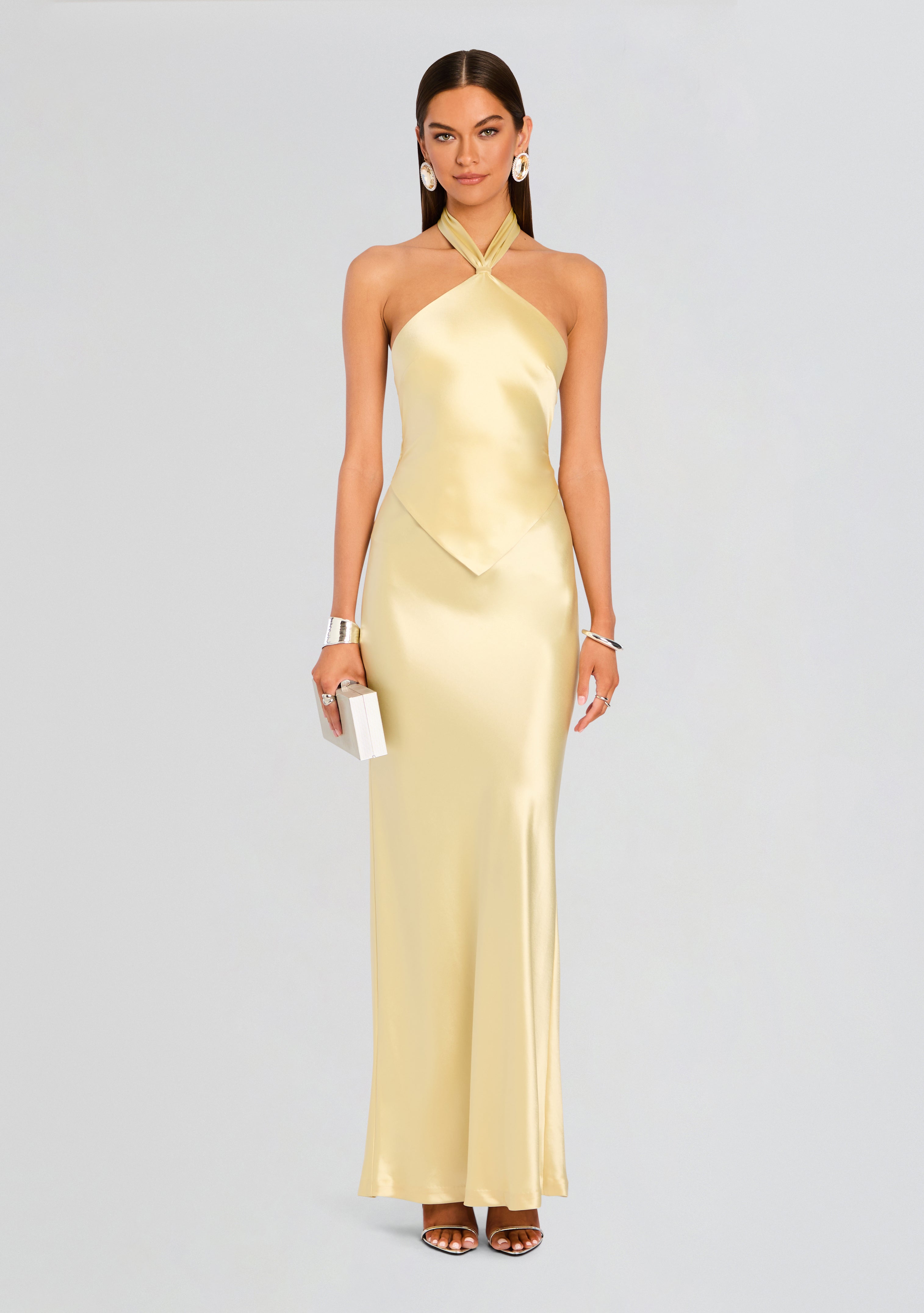 Step into a realm of elegant style with our ethereal Ester Dress. This halter neck top features two tie elements at its back and a mermaid silhouette skirt. Shown here in Yuzu.