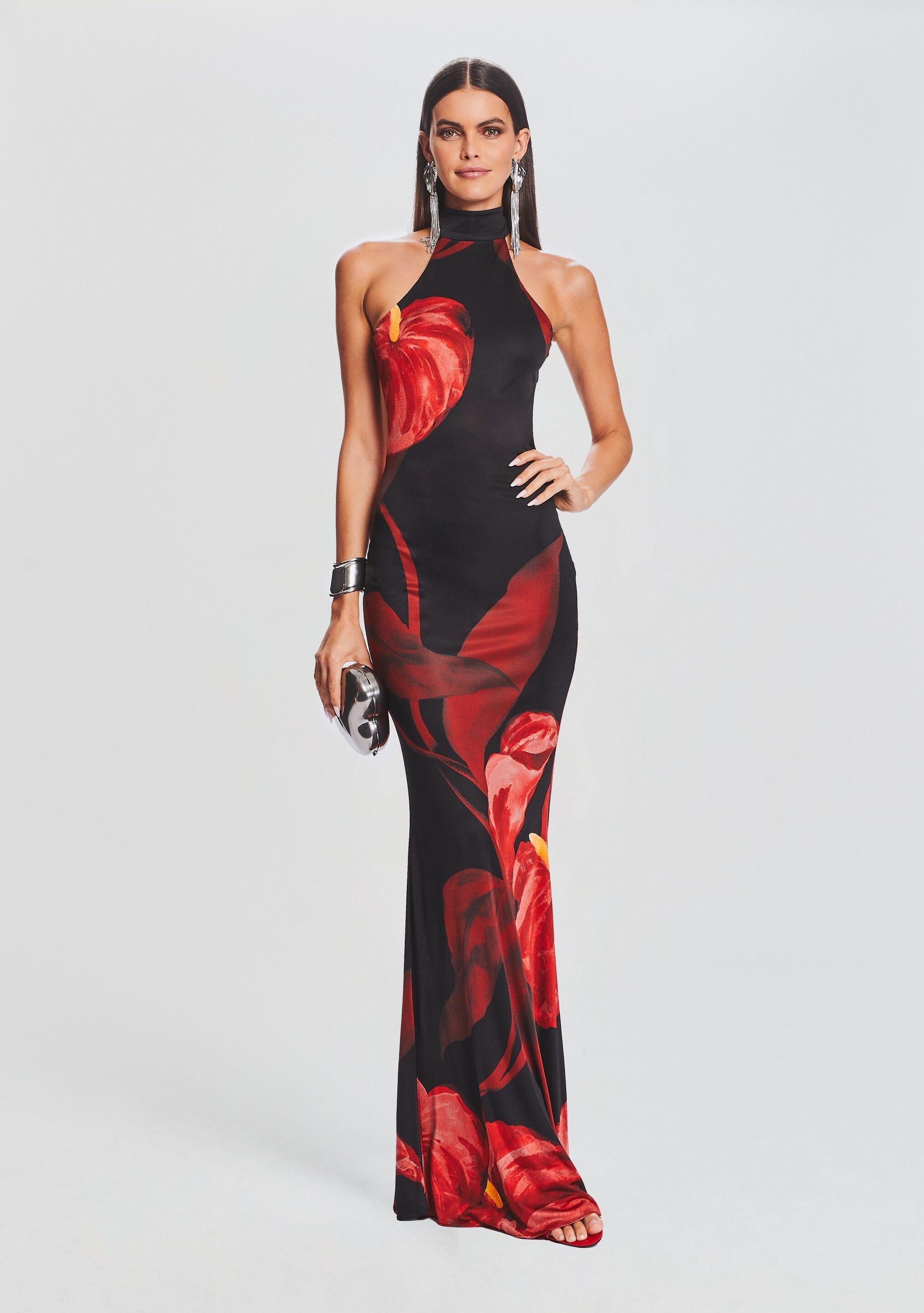 Redefine glamour with our Mabel Dress, featuring an extravagant red floral print and a captivating open back design. This gown exudes grace and style, making it the perfect choice for those seeking a modern yet sophisticated look. The halter neck adds a touch of elegance, while the open back ensures you make a statement at any formal occasion. Shown here in Red Anthurium.